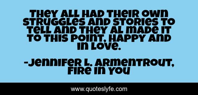 This page presents the quote "They all had their own struggles and stories to tell and they al made it to this point, happy and in love.". Author of this quote is Jennifer L. Armentrout, Fire In You. This quote is about happily-ever-after, love, happiness, affection, happy,.