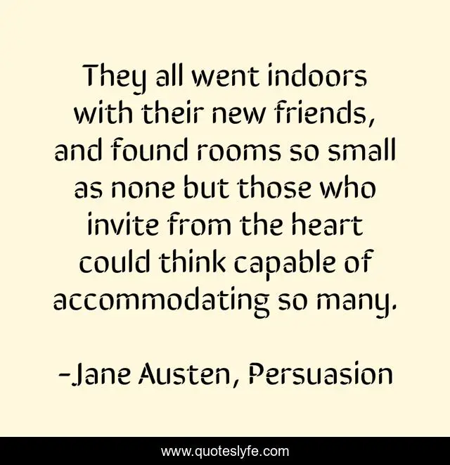 This page presents the quote "They all went indoors with their new friends, and found rooms so small as none but those who invite from the heart could think capable of accommodating so many.". Author of this quote is Jane Austen, Persuasion. .