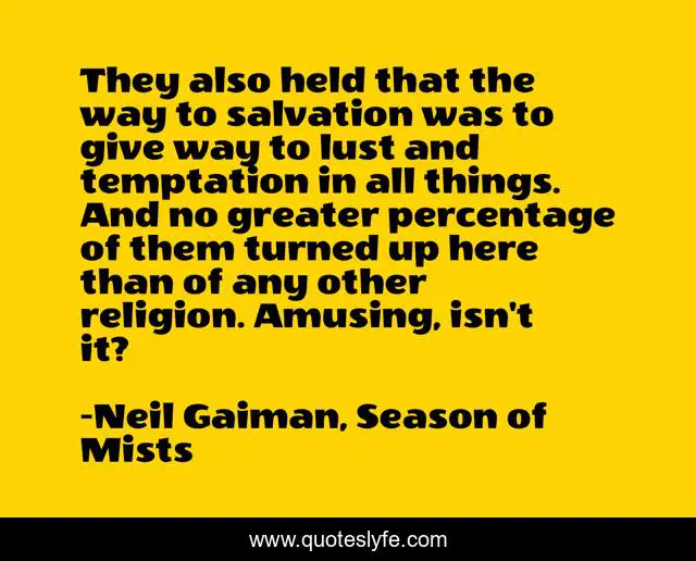 This page presents the quote "They also held that the way to salvation was to give way to lust and temptation in all things. And no greater percentage of them turned up here than of any other religion. Amusing, isn't it?". Author of this quote is Neil Gaiman, Season of Mists. This quote is about hell, lucifer,.
