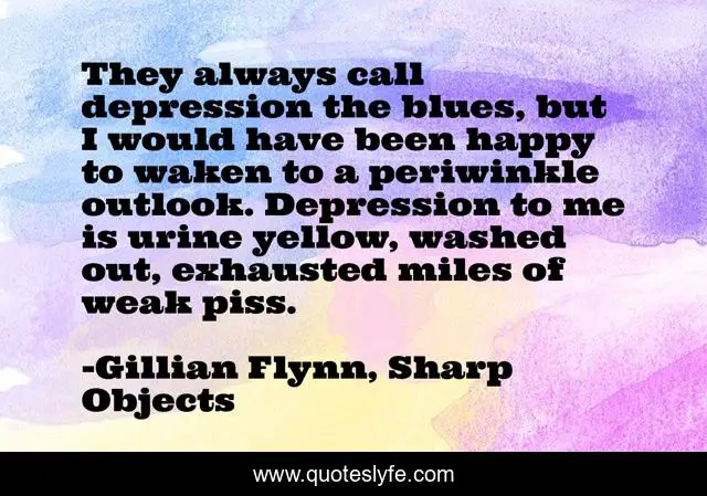 This page presents the quote "They always call depression the blues, but I would have been happy to waken to a periwinkle outlook. Depression to me is urine yellow, washed out, exhausted miles of weak piss.". Author of this quote is Gillian Flynn, Sharp Objects. .