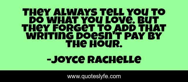 This page presents the quote "They always tell you to do what you love. But they forget to add that writing doesn't pay by the hour.". Author of this quote is Joyce Rachelle. This quote is about art, if-only, writer, writing, writer-woes, passion, do-what-you-love, finding-your-passion, writers-on-writing,.