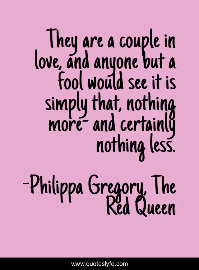 This page presents the quote "They are a couple in love, and anyone but a fool would see it is simply that, nothing more- and certainly nothing less.". Author of this quote is Philippa Gregory, The Red Queen. This quote is about the-cousins-war, lovers, love, affection,.