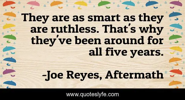 This page presents the quote "They are as smart as they are ruthless. That's why they've been around for all five years.". Author of this quote is Joe Reyes, Aftermath. This quote is about savages, survival-instinct, savagery, ruthlessness, dystopian, ruthless, intelligence, adaption, dystopian-fiction,.