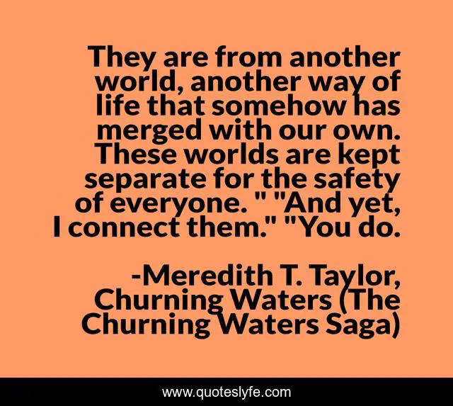 This page presents the quote "They are from another world, another way of life that somehow has merged with our own. These worlds are kept separate for the safety of everyone. " "And yet, I connect them." "You do.". Author of this quote is Meredith T. Taylor, Churning Waters (The Churning Waters Saga). This quote is about supernatural-powers, siren, suspense-romance, mermaids, supernatural, supernatural-thrillers, suspense, supernatural-romance, connections-connect,.