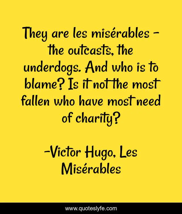 This page presents the quote "They are les misérables - the outcasts, the underdogs. And who is to blame? Is it not the most fallen who have most need of charity?". Author of this quote is Victor Hugo, Les Misérables. This quote is about poverty, truth,.