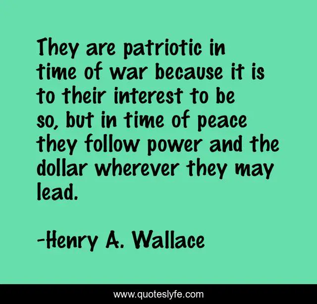 This page presents the quote "They are patriotic in time of war because it is to their interest to be so, but in time of peace they follow power and the dollar wherever they may lead.". Author of this quote is Henry A. Wallace. This quote is about peace, power, time,.
