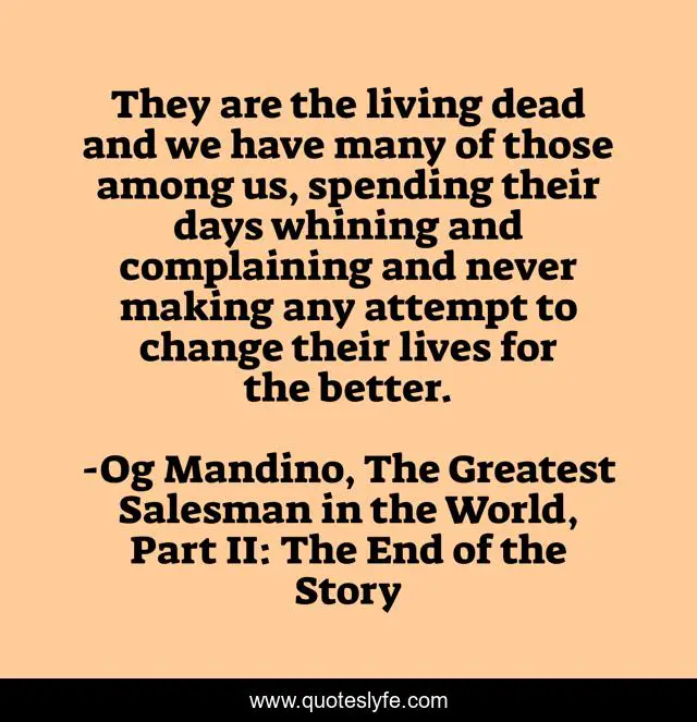 This page presents the quote "They are the living dead and we have many of those among us, spending their days whining and complaining and never making any attempt to change their lives for the better.". Author of this quote is Og Mandino, The Greatest Salesman in the World, Part II: The End of the Story. This quote is about life-philosophy, og-mandino,.