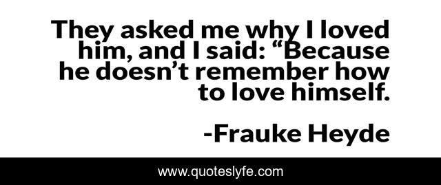 This page presents the quote "They asked me why I loved him, and I said: “Because he doesn’t remember how to love himself.". Author of this quote is Frauke Heyde. This quote is about love, pain, affection,.