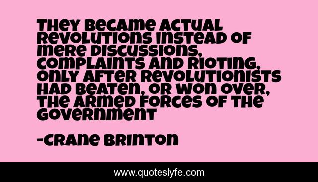 This page presents the quote "They became actual revolutions instead of mere discussions, complaints and rioting, only after revolutionists had beaten, or won over, the armed forces of the government". Author of this quote is Crane Brinton. .