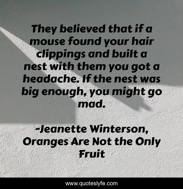 This page presents the quote "They believed that if a mouse found your hair clippings and built a nest with them you got a headache. If the nest was big enough, you might go mad.". Author of this quote is Jeanette Winterson, Oranges Are Not the Only Fruit. .