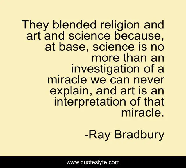 This page presents the quote "They blended religion and art and science because, at base, science is no more than an investigation of a miracle we can never explain, and art is an interpretation of that miracle.". Author of this quote is Ray Bradbury. This quote is about miracles, religion, art, science,.