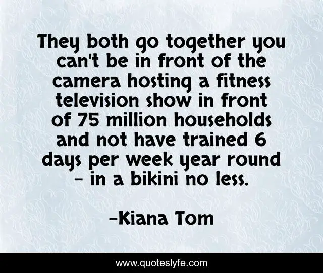 This page presents the quote "They both go together you can't be in front of the camera hosting a fitness television show in front of 75 million households and not have trained 6 days per week year round - in a bikini no less.". Author of this quote is Kiana Tom. This quote is about week, television, together,.