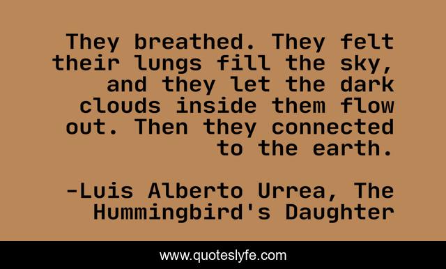 This page presents the quote "They breathed. They felt their lungs fill the sky, and they let the dark clouds inside them flow out. Then they connected to the earth.". Author of this quote is Luis Alberto Urrea, The Hummingbird's Daughter. .