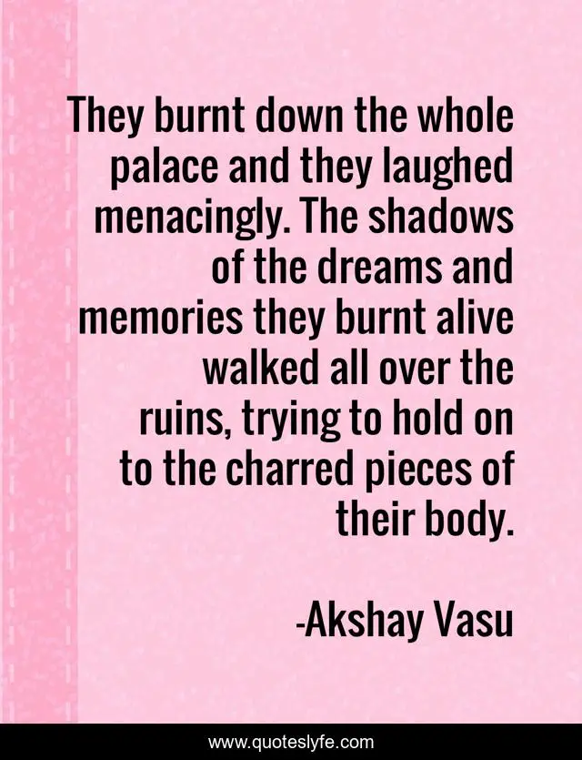 This page presents the quote "They burnt down the whole palace and they laughed menacingly. The shadows of the dreams and memories they burnt alive walked all over the ruins, trying to hold on to the charred pieces of their body.". Author of this quote is Akshay Vasu. This quote is about shadows, death, pain, palace, memories, burn, charred, pieces, down,.