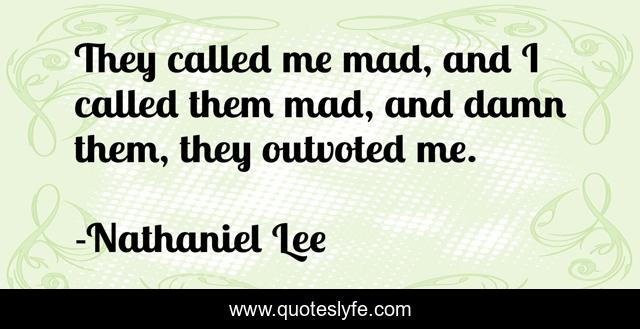 This page presents the quote "They called me mad, and I called them mad, and damn them, they outvoted me.". Author of this quote is Nathaniel Lee. This quote is about madness, insane-world, mental-health-stigma, insanity, insanity-is-normal, mental-health, mad, mental-disorder, psychiatry,.