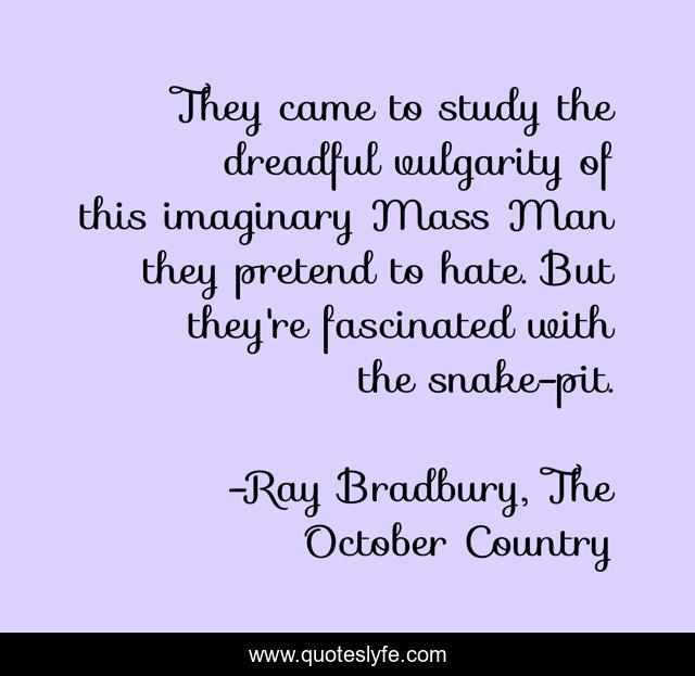 This page presents the quote "They came to study the dreadful vulgarity of this imaginary Mass Man they pretend to hate. But they're fascinated with the snake-pit.". Author of this quote is Ray Bradbury, The October Country. .