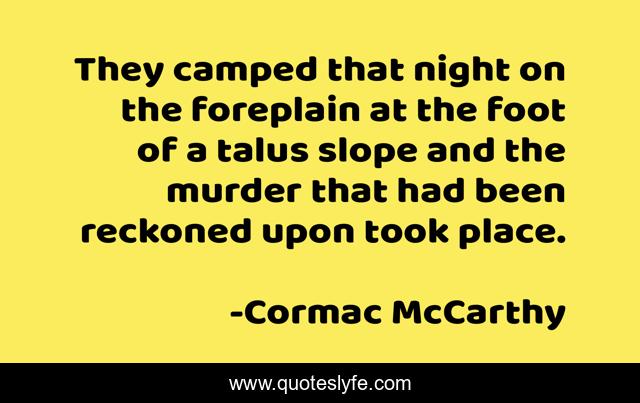 This page presents the quote "They camped that night on the foreplain at the foot of a talus slope and the murder that had been reckoned upon took place.". Author of this quote is Cormac McCarthy. This quote is about murder, foreplain,.