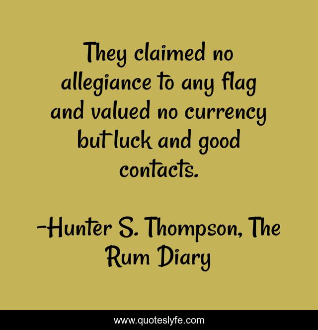 This page presents the quote "They claimed no allegiance to any flag and valued no currency but luck and good contacts.". Author of this quote is Hunter S. Thompson, The Rum Diary. This quote is about existential, luck,.