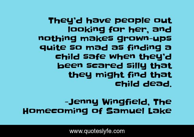 This page presents the quote "They’d have people out looking for her, and nothing makes grown-ups quite so mad as finding a child safe when they’d been scared silly that they might find that child dead.". Author of this quote is Jenny Wingfield, The Homecoming of Samuel Lake. This quote is about parenting, fear, childhood,.