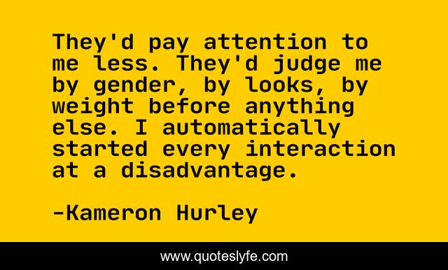 This page presents the quote "They'd pay attention to me less. They'd judge me by gender, by looks, by weight before anything else. I automatically started every interaction at a disadvantage.". Author of this quote is Kameron Hurley. This quote is about gender, misogyny, prejudice, weight,.
