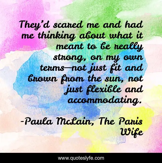 This page presents the quote "They’d scared me and had me thinking about what it meant to be really strong, on my own terms—not just fit and brown from the sun, not just flexible and accommodating.". Author of this quote is Paula McLain, The Paris Wife. .