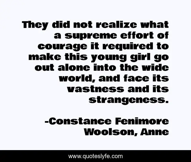 This page presents the quote "They did not realize what a supreme effort of courage it required to make this young girl go out alone into the wide world, and face its vastness and its strangeness.". Author of this quote is Constance Fenimore Woolson, Anne. This quote is about travel, courage,.