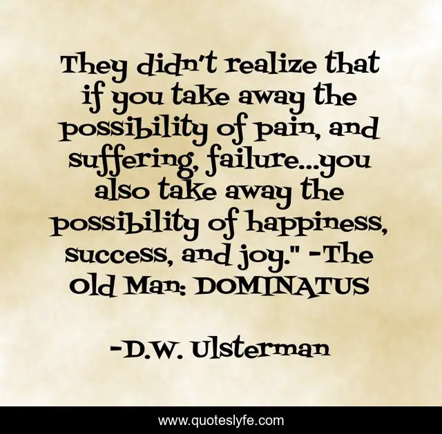 This page presents the quote "They didn’t realize that if you take away the possibility of pain, and suffering, failure…you also take away the possibility of happiness, success, and joy." -The Old Man: DOMINATUS". Author of this quote is D.W. Ulsterman. This quote is about enthusiasm, historical-fiction, inspirational,.