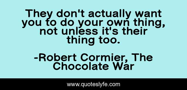 This page presents the quote "They don't actually want you to do your own thing, not unless it's their thing too.". Author of this quote is Robert Cormier, The Chocolate War. .