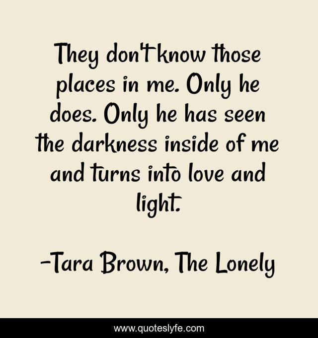 This page presents the quote "They don't know those places in me. Only he does. Only he has seen the darkness inside of me and turns into love and light.". Author of this quote is Tara Brown, The Lonely. This quote is about brown, lonely, love, affection,.