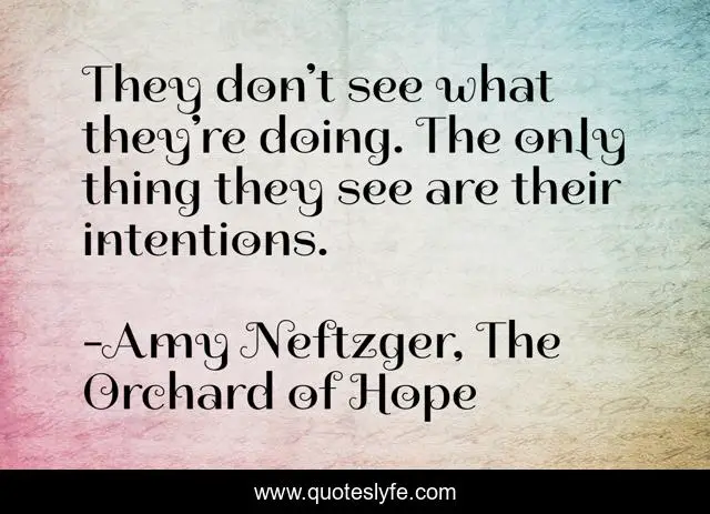 This page presents the quote "They don’t see what they’re doing. The only thing they see are their intentions.". Author of this quote is Amy Neftzger, The Orchard of Hope. This quote is about motivation, misguided-intentions, misguided-motivation, actions-speak-louder-than-words, actions, intentions, intent,.
