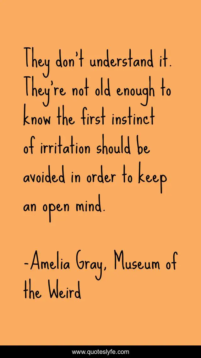 This page presents the quote "They don't understand it. They're not old enough to know the first instinct of irritation should be avoided in order to keep an open mind.". Author of this quote is Amelia Gray, Museum of the Weird. This quote is about life, knowledge,.