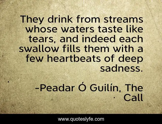 This page presents the quote "They drink from streams whose waters taste like tears, and indeed each swallow fills them with a few heartbeats of deep sadness.". Author of this quote is Peadar Ó Guilín, The Call. This quote is about quote, the-call, peadar-oguilin,.