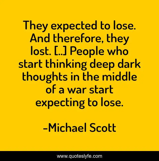 This page presents the quote "They expected to lose. And therefore, they lost. [..] People who start thinking deep dark thoughts in the middle of a war start expecting to lose.". Author of this quote is Michael Scott. This quote is about war, winning,.