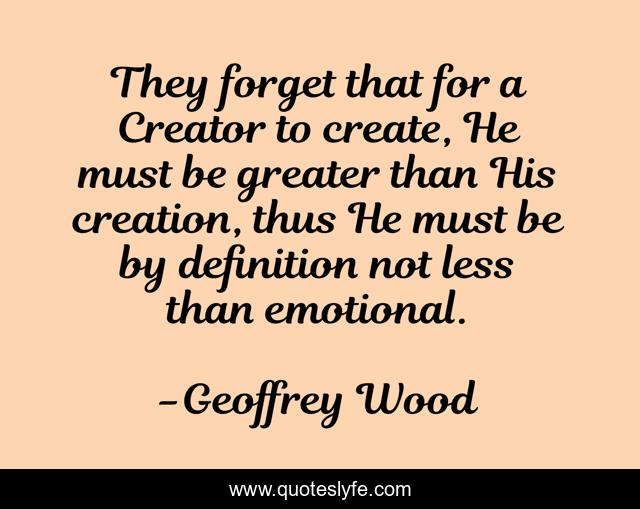 This page presents the quote "They forget that for a Creator to create, He must be greater than His creation, thus He must be by definition not less than emotional.". Author of this quote is Geoffrey Wood. This quote is about creator, god, christianity, religion, grimrack, emotional, christian-fiction,.