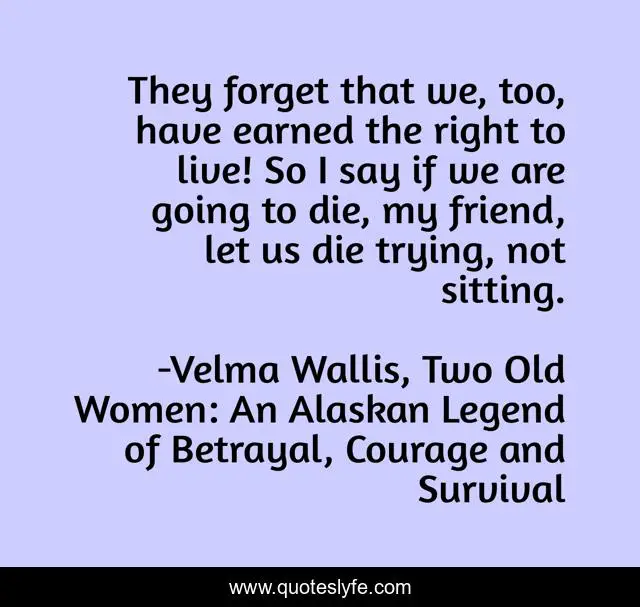 This page presents the quote "They forget that we, too, have earned the right to live! So I say if we are going to die, my friend, let us die trying, not sitting.". Author of this quote is Velma Wallis, Two Old Women: An Alaskan Legend of Betrayal, Courage and Survival. This quote is about athabaskan, survival, alaska, courage, inspirational, enthusiasm,.