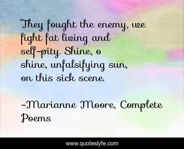 This page presents the quote "They fought the enemy, we fight fat living and self-pity. Shine, o shine, unfalsifying sun, on this sick scene.". Author of this quote is Marianne Moore, Complete Poems. This quote is about soldiers, america, war,.