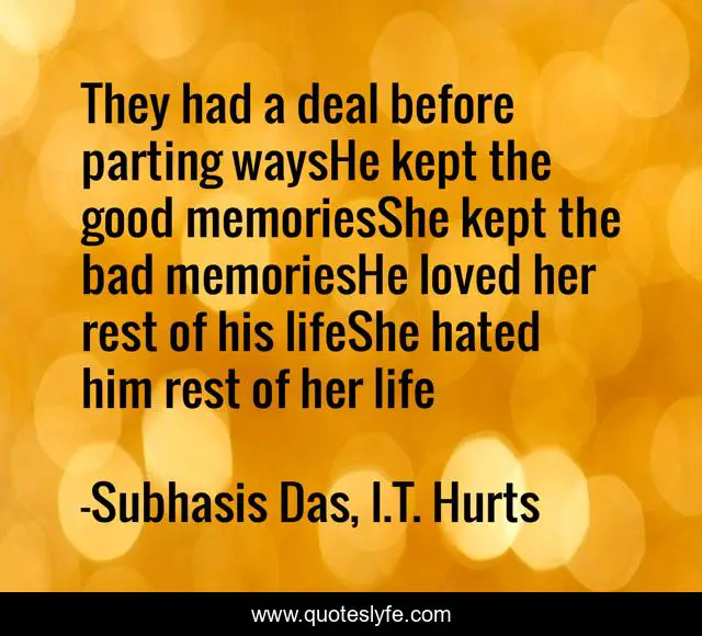 This page presents the quote "They had a deal before parting waysHe kept the good memoriesShe kept the bad memoriesHe loved her rest of his lifeShe hated him rest of her life". Author of this quote is Subhasis Das, I.T. Hurts. .