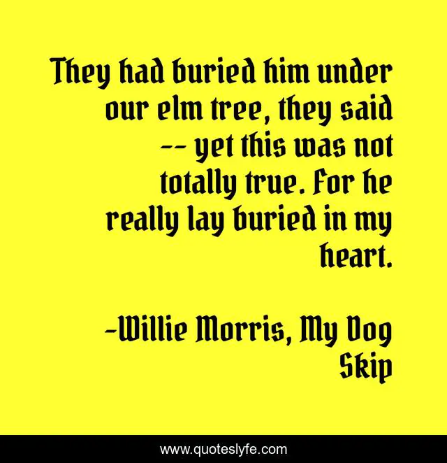 This page presents the quote "They had buried him under our elm tree, they said -- yet this was not totally true. For he really lay buried in my heart.". Author of this quote is Willie Morris, My Dog Skip. This quote is about mississippi, dogs, memoir,.