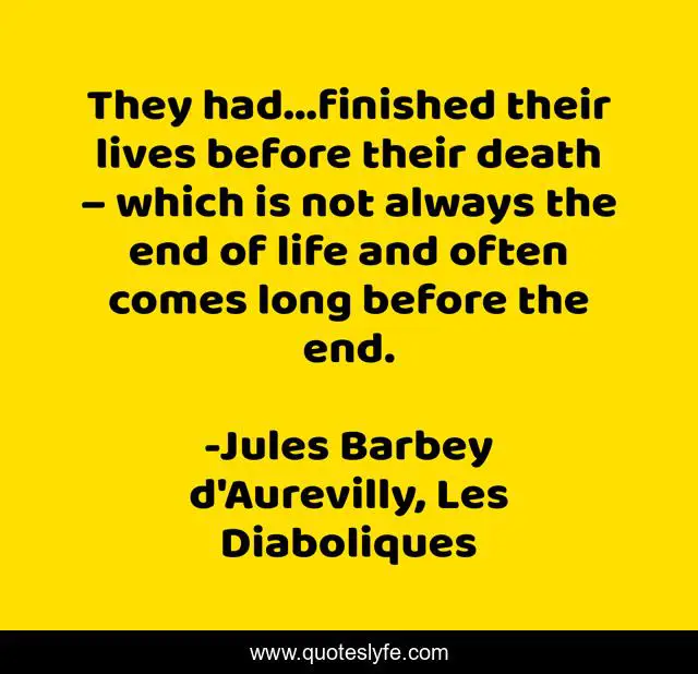 This page presents the quote "They had...finished their lives before their death – which is not always the end of life and often comes long before the end.". Author of this quote is Jules Barbey d'Aurevilly, Les Diaboliques. This quote is about atheism, dissolution, death, life, decadence,.
