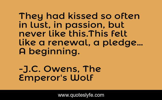 This page presents the quote "They had kissed so often in lust, in passion, but never like this.This felt like a renewal, a pledge… A beginning.". Author of this quote is J.C. Owens, The Emperor's Wolf. This quote is about m-m, kiss,.