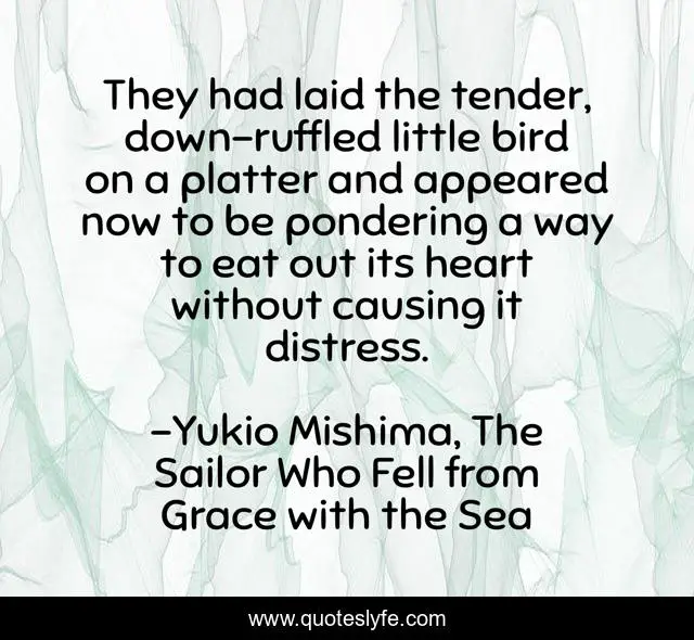 This page presents the quote "They had laid the tender, down-ruffled little bird on a platter and appeared now to be pondering a way to eat out its heart without causing it distress.". Author of this quote is Yukio Mishima, The Sailor Who Fell from Grace with the Sea. This quote is about news, childhood, children,.