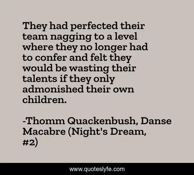This page presents the quote "They had perfected their team nagging to a level where they no longer had to confer and felt they would be wasting their talents if they only admonished their own children.". Author of this quote is Thomm Quackenbush, Danse Macabre (Night's Dream, #2). This quote is about admonish, nagging, nag, parent, parenting,.