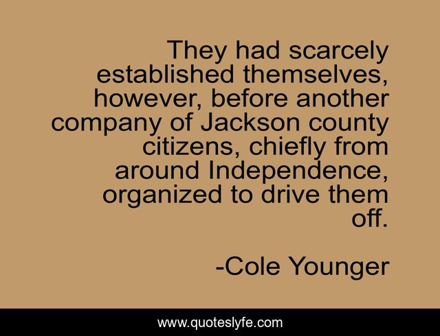 This page presents the quote "They had scarcely established themselves, however, before another company of Jackson county citizens, chiefly from around Independence, organized to drive them off.". Author of this quote is Cole Younger. This quote is about company, citizens, drive,.
