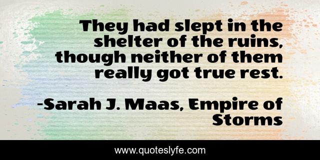 This page presents the quote "They had slept in the shelter of the ruins, though neither of them really got true rest.". Author of this quote is Sarah J. Maas, Empire of Storms. This quote is about sarah-j-maas, shelter, empire-of-storms, rest, eos, sleep, throne-of-glass, ruins, tog,.