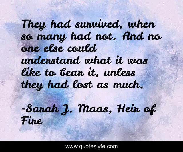 This page presents the quote "They had survived, when so many had not. And no one else could understand what it was like to bear it, unless they had lost as much.". Author of this quote is Sarah J. Maas, Heir of Fire. This quote is about survival, heir-of-fire,.