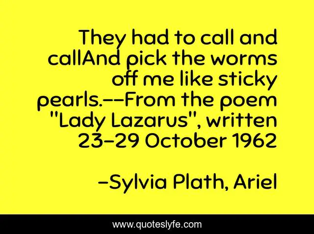 This page presents the quote "They had to call and callAnd pick the worms off me like sticky pearls.--From the poem "Lady Lazarus", written 23-29 October 1962". Author of this quote is Sylvia Plath, Ariel. This quote is about depression, lady-lazarus,.