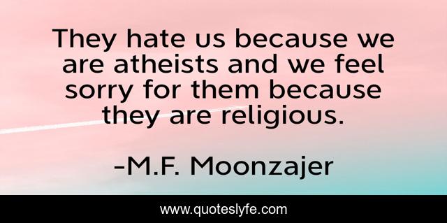 This page presents the quote "They hate us because we are atheists and we feel sorry for them because they are religious.". Author of this quote is M.F. Moonzajer. This quote is about atheist, sorry, hate, religious,.