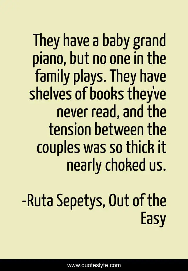 This page presents the quote "They have a baby grand piano, but no one in the family plays. They have shelves of books they've never read, and the tension between the couples was so thick it nearly choked us.". Author of this quote is Ruta Sepetys, Out of the Easy. This quote is about wealth, happiness,.