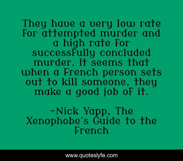 This page presents the quote "They have a very low rate for attempted murder and a high rate for successfully concluded murder. It seems that when a French person sets out to kill someone, they make a good job of it.". Author of this quote is Nick Yapp, The Xenophobe's Guide to the French. This quote is about murder, nick-yapp, michael-syrett, france, french-people, attempted-murder, crime,.