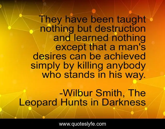 This page presents the quote "They have been taught nothing but destruction and learned nothing except that a man's desires can be achieved simply by killing anybody who stands in his way.". Author of this quote is Wilbur Smith, The Leopard Hunts in Darkness. This quote is about desire, destruction, killing,.